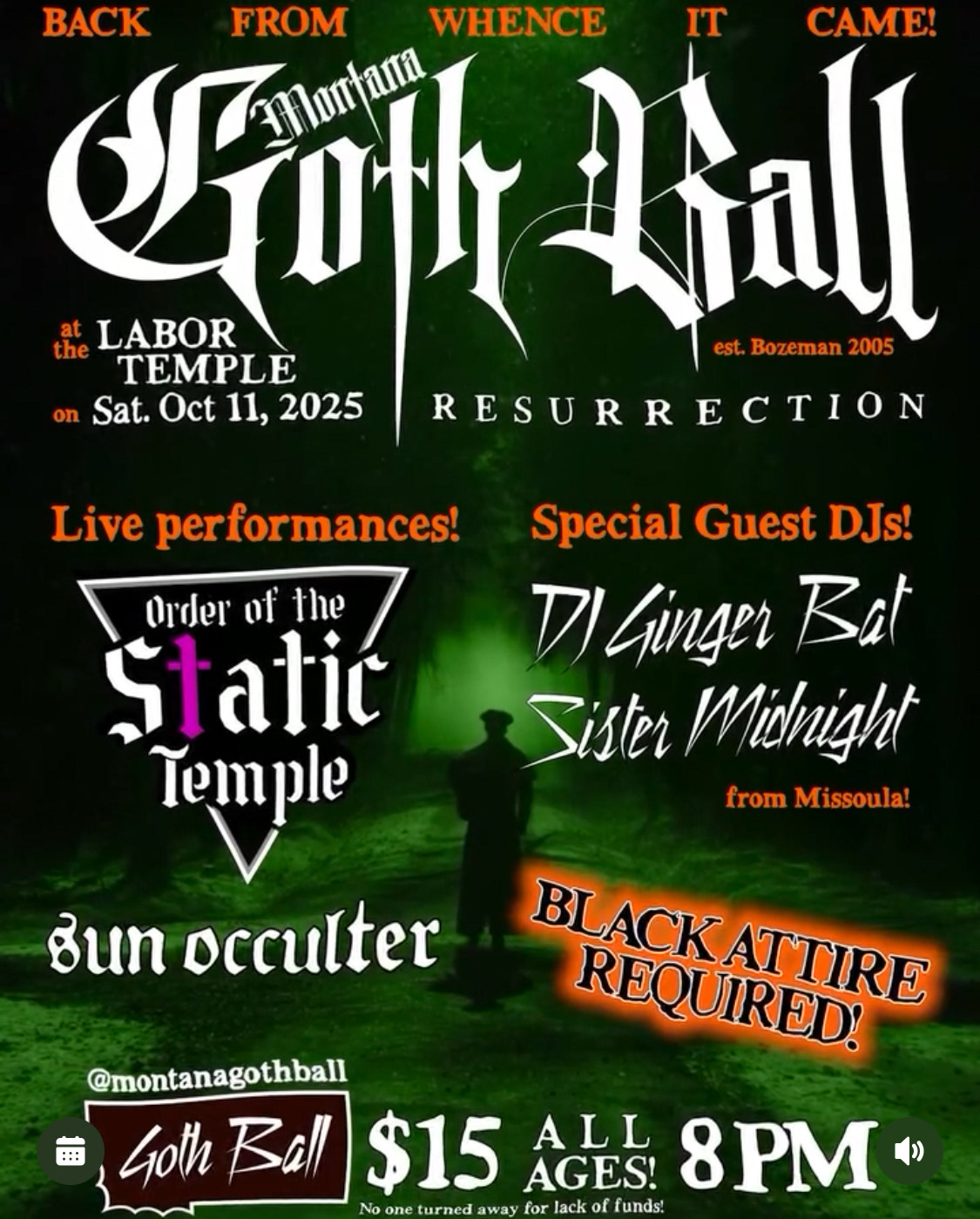 Did you know it all began in Bozeman in 2005 as a theme party amongst friends? Montana Goth Ball evolved into our state’s beacon of delightful darkness, welcoming in all would heed the call. In the modern era, under the spooky stewardship of DJ Ginger Bat, Goth Ball established Missoula as its new home, throwing regular celebrations and hosting traveling musicians who would dare tread through our remote state! It is my honor to summon the ghost of Bozeman Goth Ball past!